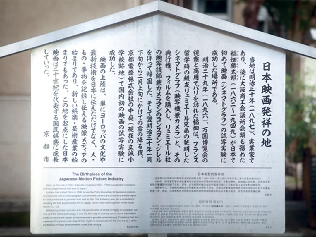 세계에서의 영화의 시작은, 1895년, 파리의 그란 카페에서, 류미에르 형제가 발명한 시네마토 그래프를 유료로 일반 공개했다고 하는 이야기가 있습니다. ※제설 있음 이 2년 후, 교토·니시진에서 파리에 유학하고 있던 이나바타 카츠타로가, 류미에르 형제와 클래스메이트였기 때문에, 귀국시 「시네마토그래프」를 가져와, 「교토」의 키야마치에서 일본 최초의 시사를 행한 것으로부터, 「교토」는 일본 영화 발상의.