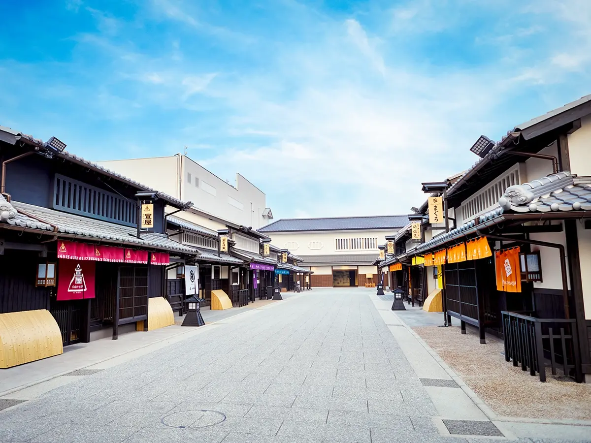 메인 스테이지를 갖춘 오테몬광장. 심볼 나무는 사계절에서 표정을 바꾸고 머리 위에서는 줄다리기 닌자의 연출도 즐길 수 있다.